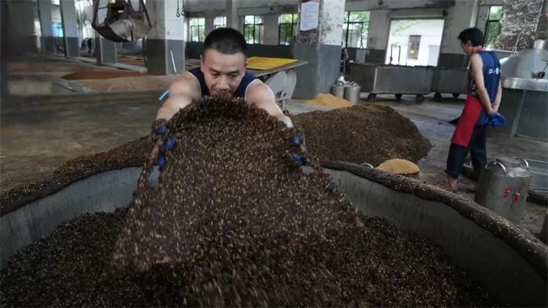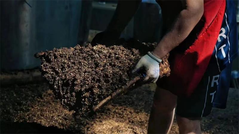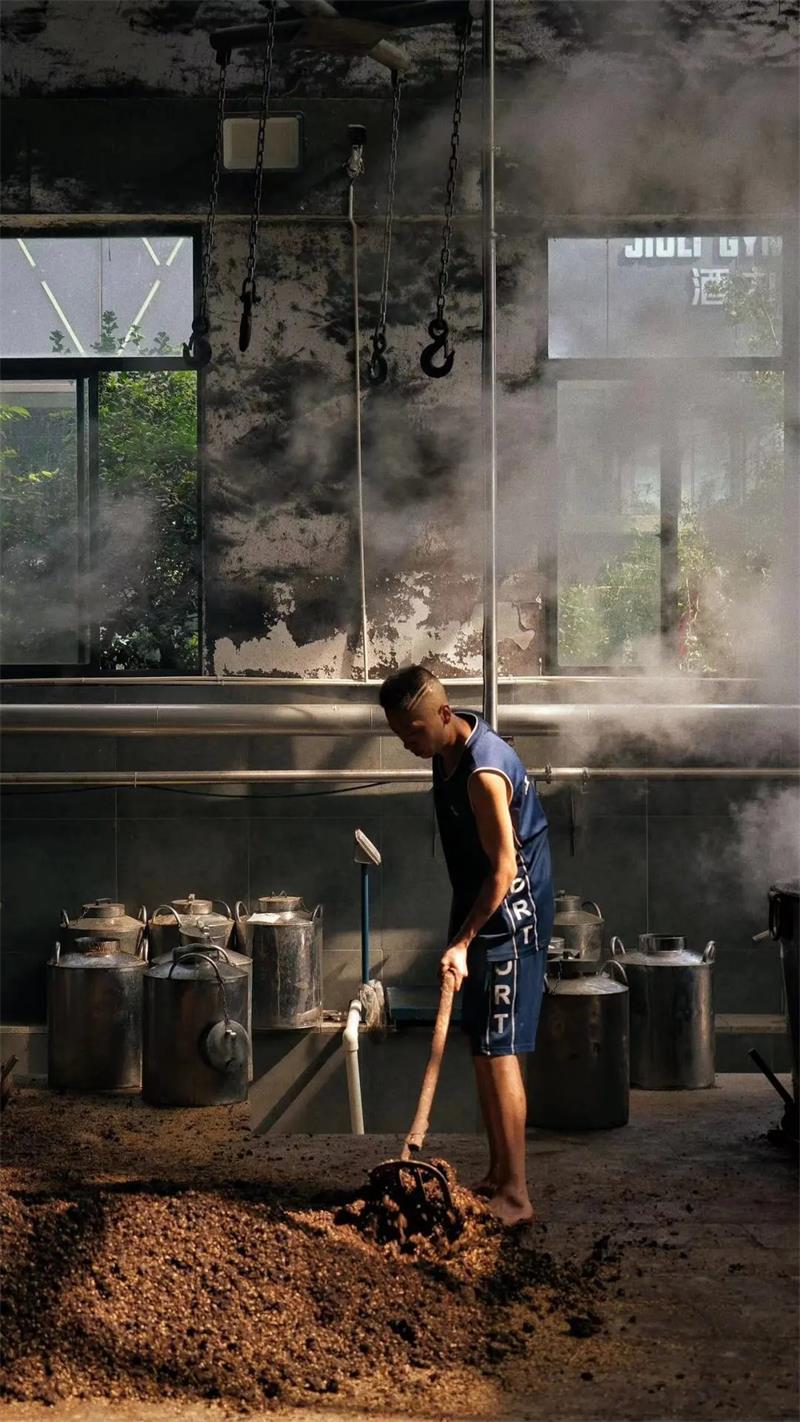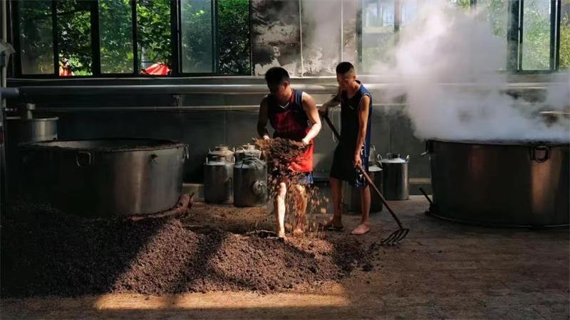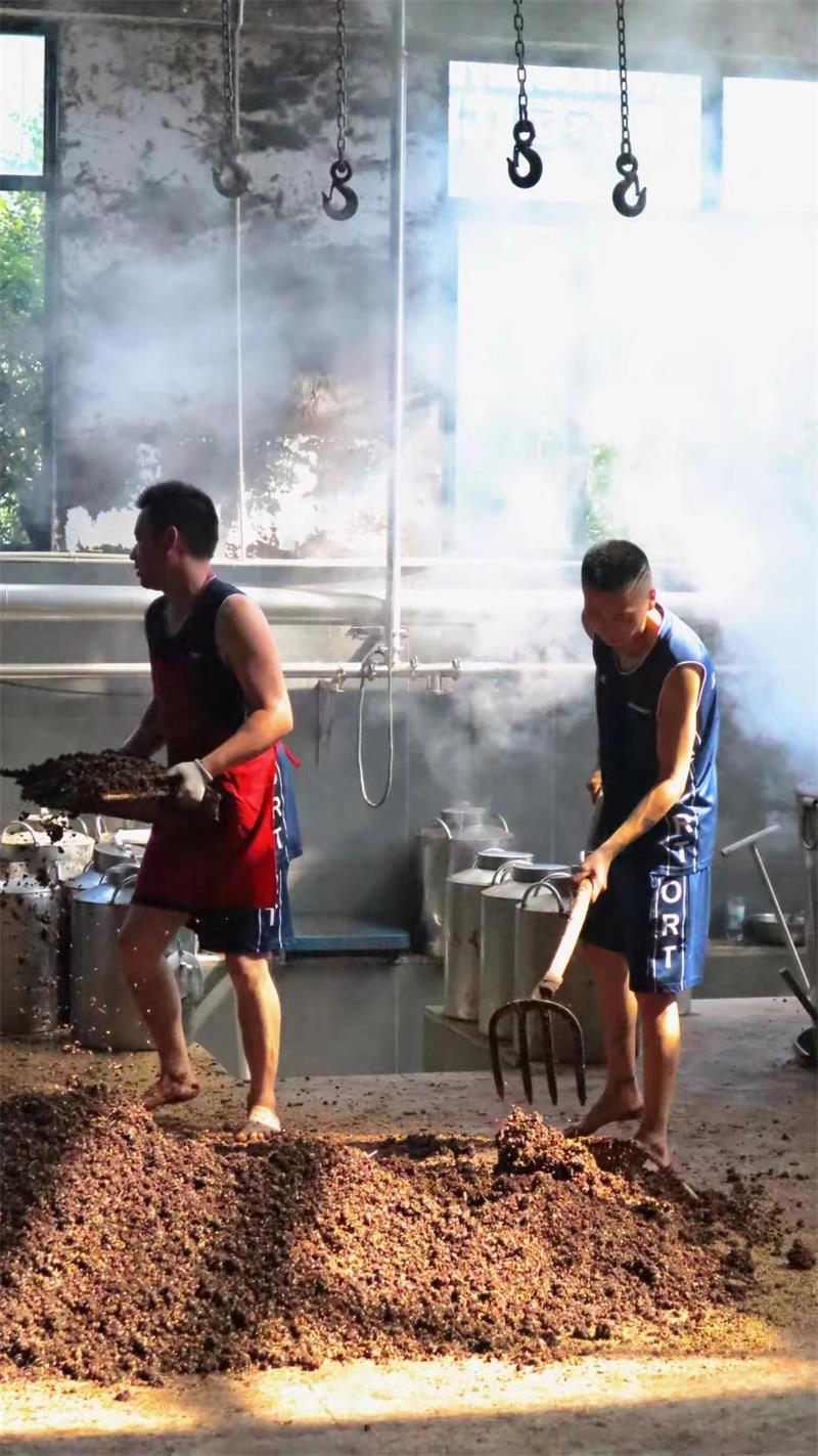 工廠,釀酒工人們正將發酵后的紅高粱放